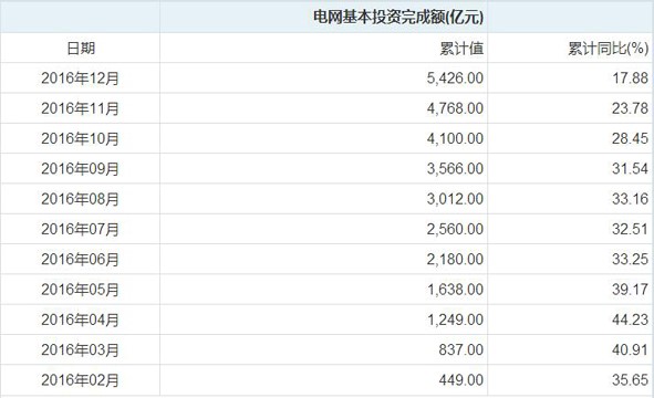 下面是2016年我國(guó)的電網(wǎng)投資完成額統(tǒng)計(jì):